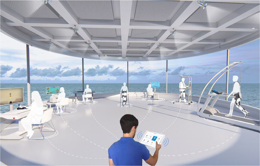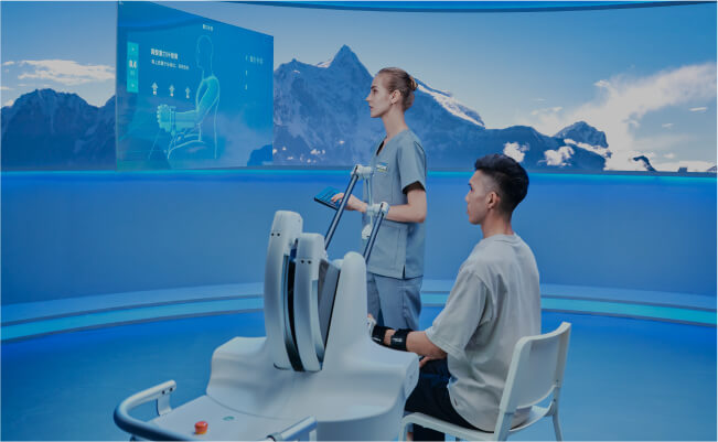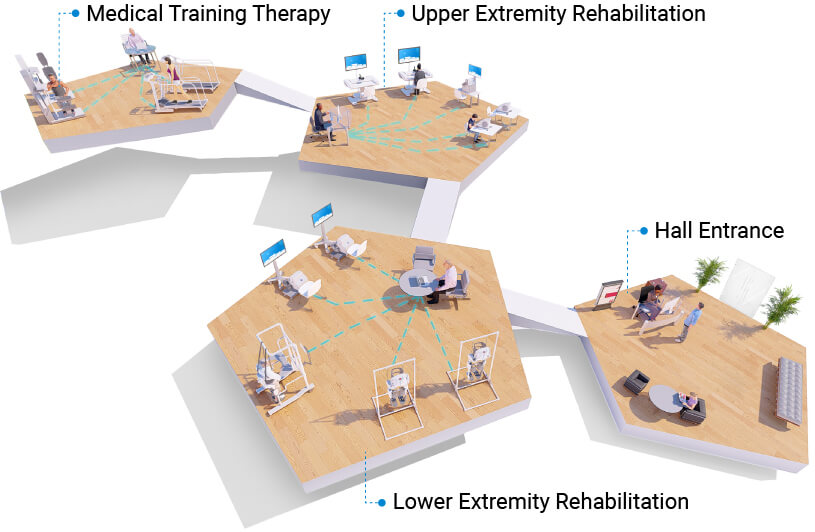 以康复机器人为核心的现代化康复中心,设置多台功能互补、数据互联的康复机器人,实现诊疗全流程智能化、数据化、标准化,达到多机协同、少人值守、效率显著提升的效果,帮助医疗康养机构从零构建标准化康复服务能力。
